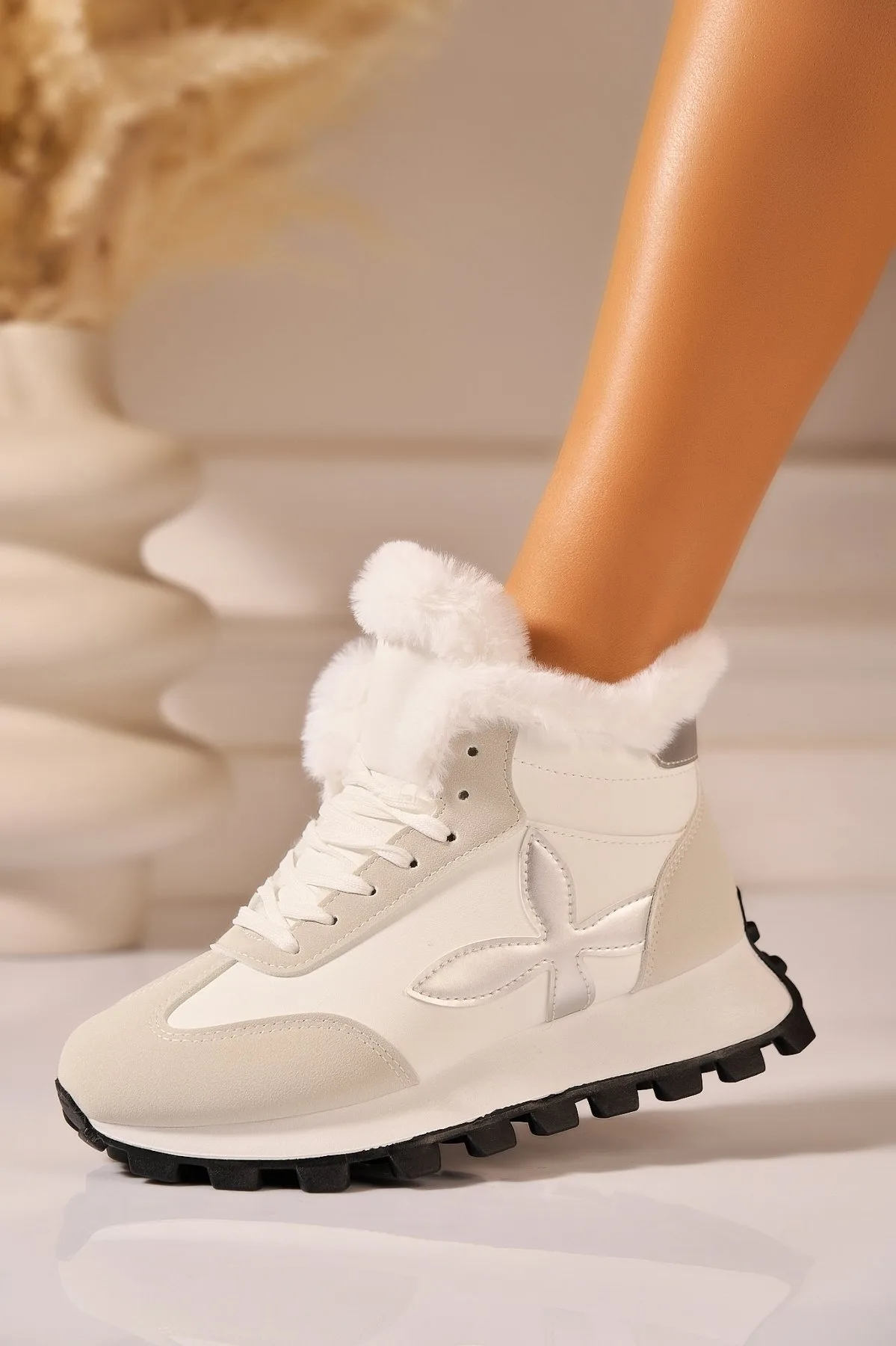 Ghete și Bocanci damă – Ghete Dama Imblanite Albe din Piele Ecologica Wrya